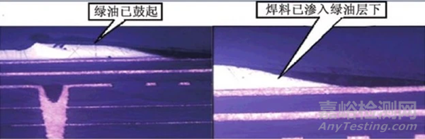 為了對缺陷現(xiàn)象進(jìn)一步定性,特在起泡位置進(jìn)行切片分析,從切片觀察可見焊膏已經(jīng)滲入阻焊層下面。