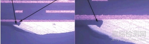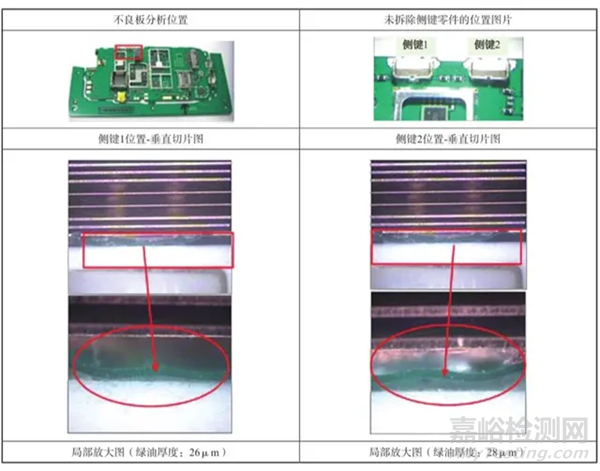 從切片圖片來看,未拆除側(cè)鍵零件的不良板在側(cè)鍵位置的綠油有鼓起現(xiàn)象。