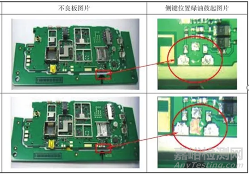 從2pcs不良樣品板外觀來看,拆除側(cè)鍵零件后綠油有明顯鼓起或脫落現(xiàn)象。