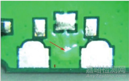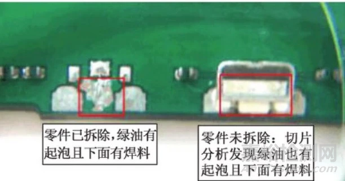為確認(rèn)在未拆除側(cè)鍵零件前綠油在零件下的狀況,取具有不良現(xiàn)象的PCBA進(jìn)行切片分析。