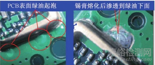 所用焊膏與阻焊層油墨的匹配性不良,在再流焊接過程中,焊膏中的助焊劑對阻焊層油墨的攻擊,使阻焊層發(fā)白起泡,進(jìn)而使阻焊層脫落。