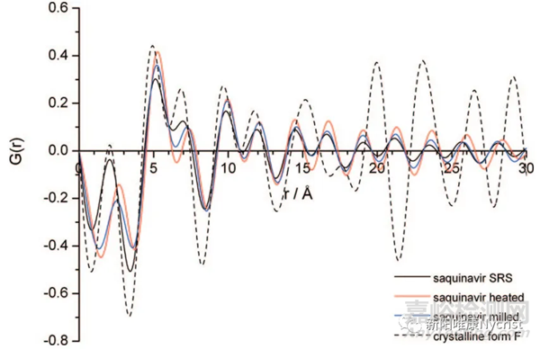 使用粉末X射線衍射法(PXRD)測(cè)定物質(zhì)形態(tài)時(shí),結(jié)晶態(tài)物質(zhì)的PXRD圖譜呈銳峰,無定型態(tài)物質(zhì)PXRD圖譜呈彌散峰。若判斷兩個(gè)無定型態(tài)樣品的狀態(tài)一致時(shí),應(yīng)滿足彌散衍射峰幾何拓?fù)湫螤钔耆恢?。但是,無定型PXRD圖譜中彌散衍射峰幾何拓?fù)湫螤顭o法直接分辨,需要通過PDF技術(shù)(Atomic Pairwise Distribution Function Analysis)進(jìn)行變換來進(jìn)行分析。