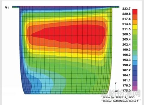 穩(wěn)態(tài)熔體溫度可以使用有限元分析來計算。圖1顯示了計量部分螺桿通道橫截面的熔體溫度分布。該圖顯示,通道的寬度和深度上可能會發(fā)生顯著的溫度變化。最大的溫度梯度出現(xiàn)在整個通道的深度。