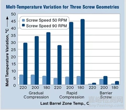 圖 2:與屏障螺桿相比,簡單輸送螺桿(逐漸或快速壓縮)的熔體溫度變化相當(dāng)大。90 rpm 時的溫度變化大于 50 rpm時的溫度變化。橫軸上的數(shù)字指的是最后一個機筒區(qū)域的溫度(°C)。