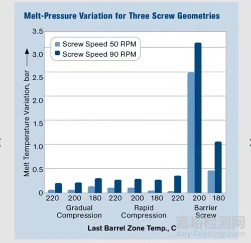 圖 3:高熔體溫度變化并不一定會導(dǎo)致大的壓力波動。此處顯示了相同的三個螺桿在”。的些些度》!義發(fā)動相很下的熔體壓力變化。屏障桿的熔體溫度變化小是一個明顯的優(yōu)點,但熔體壓力變化大是一個缺點。