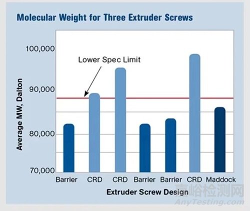 圖4:這些數(shù)據(jù)由一家醫(yī)療設(shè)備公司開發(fā)。在0.75英寸螺釘上使用TPE的試驗中評估了三種螺釘幾何形狀,擠出機(CRD 和屏障設(shè)計測試了3次)。屏障和 Maddock混合螺桿無法產(chǎn)生高于指定水平的MW值。
