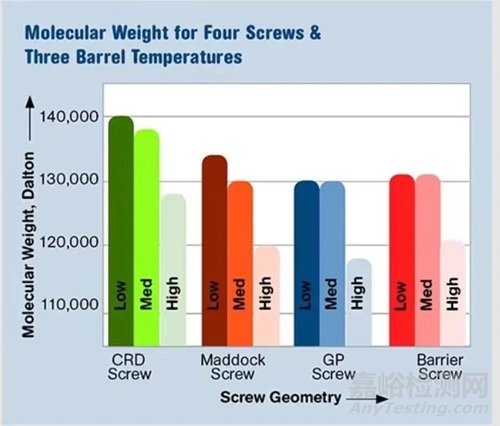 圖 5 顯示了不同擠出機螺桿的更多 MW 結(jié)果。每個螺桿在三種不同的溫度曲線下運行。“低”表示機筒溫度為 375-385-395 F。“中”表示機筒溫度為 395-420-415 F。“高”表示機筒溫度為 400-420-420 F。對于 CRD 螺桿達到的每個溫度分布最好的分子量結(jié)果。Maddock 螺桿、通用螺桿和屏障螺桿的分子量結(jié)果沒有顯著差異。