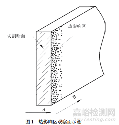 將試樣鑲嵌、研磨、拋光,用體積分?jǐn)?shù)為4%的硝酸乙醇溶液腐蝕試樣并將其吹干,將試樣置于光學(xué)顯微鏡下觀察。熱影響區(qū)觀察面如圖1所示。
