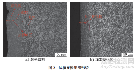 激光切割后,觀察試樣表面(如圖1中B面)的熱影響區(qū),結(jié)果如圖2所示,熱影響區(qū)和基體之間界線清晰可見(jiàn)。熱影響區(qū)可分為兩部分,第一部分為激光切縫邊緣部分的熔化區(qū),第二部分為熔化區(qū)和基體之間的非熔化區(qū)。激光切割時(shí)靠近切縫中心的熱影響區(qū)溫度急速上升,達(dá)到并超過(guò)相變溫度點(diǎn),激光束經(jīng)過(guò)后,由于輔助氣體的冷卻和傳熱作用,溫度快速降低,由基體向熔化區(qū)的晶粒逐漸變大。熔化區(qū)由基體的馬氏體+ 鐵素體全部轉(zhuǎn)變?yōu)轳R氏體。非熔化區(qū)的溫度較低,冷卻速率較慢,由基體的馬氏體+鐵素體轉(zhuǎn)變?yōu)轳R氏體+貝氏體。經(jīng)過(guò)加工中心加工后,觀察試樣表面的加工硬化區(qū),顯微組織如圖2b)所示,加工硬化區(qū)受外來(lái)擠壓,導(dǎo)致晶粒變形,組織未發(fā)生變化。