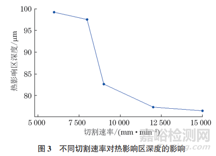 對(duì)牌號(hào)為590DP,厚度為1.6mm的材料進(jìn)行分析,得到激光切割速率越快,熱影響區(qū)深度越?。ㄒ?jiàn)圖3)。但切割速率過(guò)快或過(guò)慢都可能會(huì)導(dǎo)致材料下表面出現(xiàn)掛渣現(xiàn)象,在切割速率為9000mm/min時(shí)切割質(zhì)量最優(yōu)。