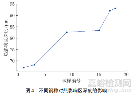 對(duì)厚度為1.6mm,切割速率為9000mm/min的材料進(jìn)行分析,得到鋼種級(jí)別越高、強(qiáng)度越大,激光切割的熱影響區(qū)深度越大(見(jiàn)圖4)。