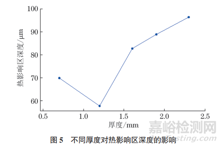 對(duì)牌號(hào)為590DP,切割速率為9000mm/min 的材料進(jìn)行分析,得到厚度越厚,激光切割熱影響區(qū)的深度越大(見(jiàn)圖5)。