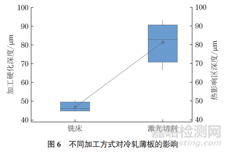 對(duì)比激光切割熱影響區(qū)深度與加工中心的加工硬化深度,發(fā)現(xiàn)鋼種的強(qiáng)度對(duì)激光切割熱影響區(qū)深度的影響較明顯,對(duì)加工硬化深度影響不大,但激光切割的熱影響區(qū)深度比加工中心的加工硬化深度大35μm左右(見(jiàn)圖6)。