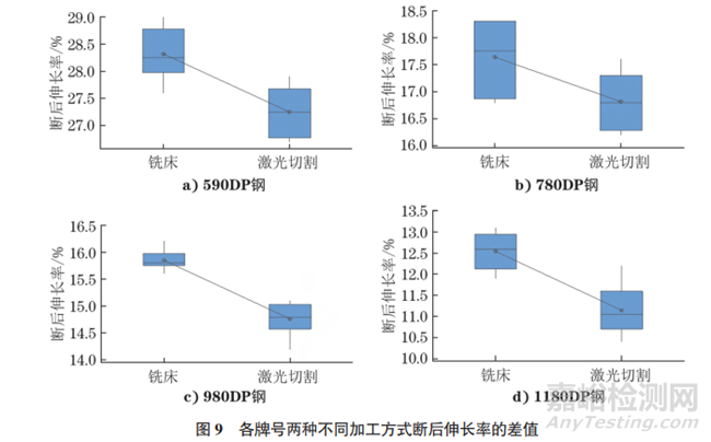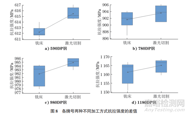 (4)激光切割加工試樣的屈服強(qiáng)度和抗拉強(qiáng)度比加工中心加工試樣的高,斷后伸長(zhǎng)率低,且隨著鋼種等級(jí)的提高,兩者間的差異越大。通過(guò)激光切割制備拉伸試樣時(shí),建議參照GB/T 2975—2018 標(biāo)準(zhǔn)保留1~2mm加工余量。