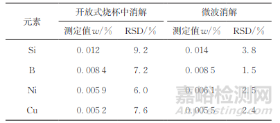 目前,在燒杯中溶解樣品時,消解時間短,便于觀察,但溫度不易控制,易揮發(fā)元素和微量元素容易損失。試驗以YS/T 1262— 2018中采用的30mL50%鹽酸溶液+2mL氫 氟 酸+2mL硝酸為消解酸體系,比較了兩種消解方式(開放式燒杯中消解與微波消解)消解同一樣品后上述易揮發(fā)元素和微量元素(Si、B、Ni、Cu)的測定值及其相對標(biāo)準(zhǔn)偏差(RSD),結(jié)果見表1。