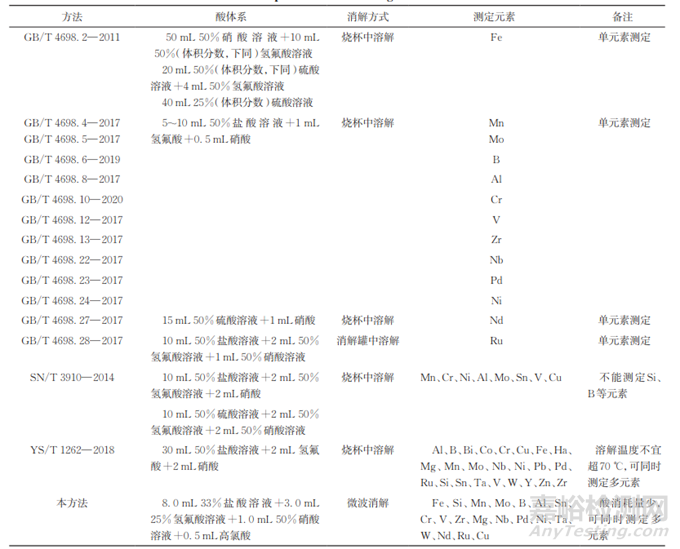 目前,采用ICP-AES測定鈦及鈦合金的樣品消解標(biāo)準(zhǔn)方法列于表2。