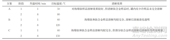微波消解升溫時間和目標(biāo)溫度影響著樣品的消解效果。在梯度升溫模式下,試驗考察了升溫時間和目標(biāo)溫度對同一樣品(海綿鈦、鈦合金)消解效果的影響,結(jié)果見表3。
