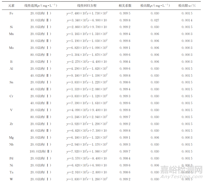 基質(zhì)匹配的多元素混合標(biāo)準(zhǔn)溶液系列Ⅱ的配制:稱取適量的高純鈦1份,前處理后,轉(zhuǎn)移至100mL容量瓶中,用5%硝酸溶液定容。從中分取5.0mL至6支50mL容量瓶中,加入適量1000mg·L−1的Fe、Mn、Mo、Al、Sn、Cr、V、Zr、Nb、Cu單元素標(biāo)準(zhǔn)儲備溶液,用5%硝酸溶液定容,配制成Fe、Mn、Cu質(zhì)量濃度為 0,1.0,2.0,4.0,6.0,10.0mg·L−1,Mo、V質(zhì)量濃度為0,1.0,5.0,20.0,40.0,80.0mg·L− 1,Al、Sn、Cr、Zr質(zhì)量濃度為0,1.0,5.0,10.0,20.0,40.0mg·L−1,Nb質(zhì)量濃度為0,2.0,10.0,30.0,60.0,100.0mg·L−1的基質(zhì)匹配的多元素混合標(biāo)準(zhǔn)溶液系列Ⅱ,用于測定質(zhì)量分?jǐn)?shù)大于1.0%的元素。