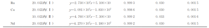 按照儀器工作條件,測定基質(zhì)匹配的多元素混合標(biāo)準(zhǔn)溶液系列Ⅰ或系列Ⅱ,以待測元素的質(zhì)量濃度為橫坐標(biāo),以對應(yīng)的響應(yīng)強度為縱坐標(biāo)繪制工作曲線。所得線性參數(shù)見表4。