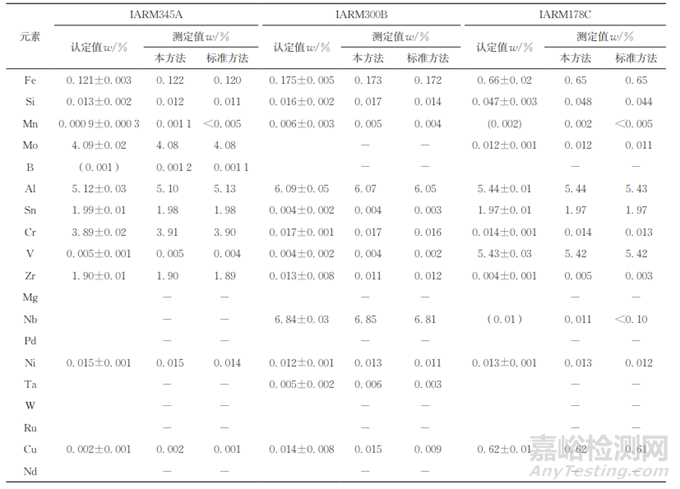 按照試驗方法測定4種鈦合金標(biāo)準(zhǔn)樣品IARM345A、IARM300B、IARM178C和IARM303B中元素含量,并與標(biāo)準(zhǔn)方法 GB/T 4698系列(以下簡稱標(biāo)準(zhǔn)方法)的測定結(jié)果進行對比。其中鈦合金標(biāo)準(zhǔn)樣品IARM303B(Pd認定值為0.13%±0.01%)用于驗證本方法測定Pd的準(zhǔn)確度,結(jié)果顯示本方法的測定值為0.13%,標(biāo)準(zhǔn)方法的測定值為 0.12%。其他標(biāo)準(zhǔn)樣品中元素的測定結(jié)果見表5。