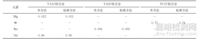 由于鈦合金標(biāo)準(zhǔn)樣品中不含Mg、W、Ru、Nd等4種元素,因此按照試驗方法和標(biāo)準(zhǔn)方法分析含上述4種元素的3種實際樣品(TA12 鈦合金、TA26鈦合金和TC25鈦合金),以驗證測定這4種元素的方法準(zhǔn)確度,結(jié)果見表6。