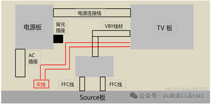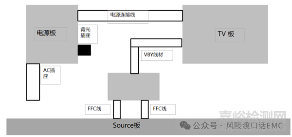 調(diào)整系統(tǒng)內(nèi)部布線方式,使按鍵遙控線材、喇叭線材、Wi-Fi天線、藍牙天線遠離屏時序電路板與屏驅(qū)動信號電路板之間的FFC線纜,防止空間耦合。