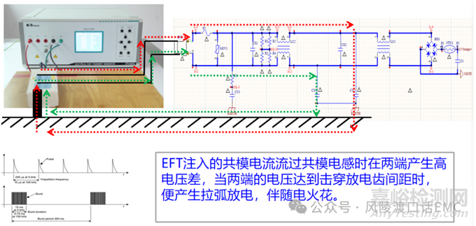 電快速脈沖群(EFT)高頻電流會產(chǎn)生豐富的磁場輻射,在信號環(huán)路中產(chǎn)生感應電流與感應電動勢,尤其是敏感信號環(huán)路或者小 信號電流環(huán)路,引起其工作狀態(tài)的改變及誤動作。電快速脈沖群(EFT)高頻電流在共模阻抗上產(chǎn)生強電場干擾,在高阻抗長距離傳輸信號線上、產(chǎn)生感應電壓,脈沖電壓進入芯片時,芯片會因為過壓保護,或者引起芯片內(nèi)部敏感電路的誤動作,導致異常現(xiàn)象出現(xiàn)。