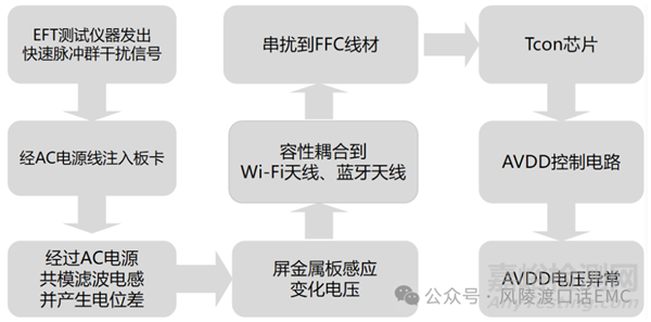 當Wi-Fi天線、藍牙天線緊貼屏時序控制電路板與屏驅(qū)動信號電路板之間的FFC線纜布線時,電快速脈沖群(EFT)干擾則天線耦合到FFC線纜上,進入屏時序控制電路板,從而干擾時序控制電路板上敏感電路,導致AVDD電壓輸出異常,引發(fā)黑屏現(xiàn)象。