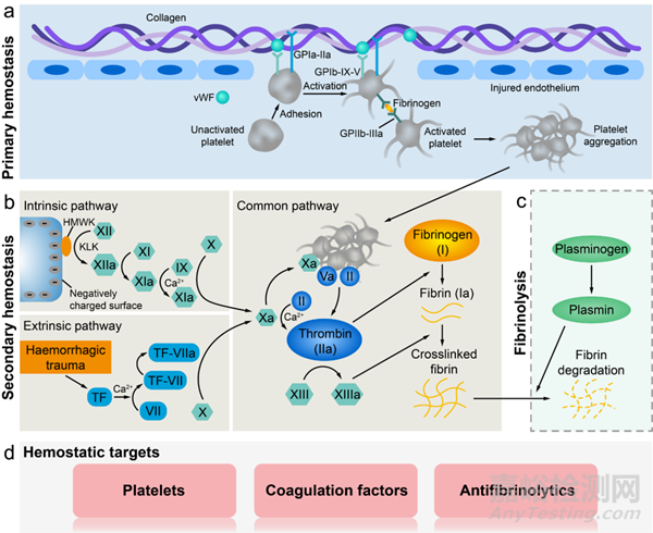 在設(shè)計材料時,具體的止血靶點包括血小板、凝血因子和抗纖溶藥物等。已經(jīng)廣泛應(yīng)用于臨床的生物化學(xué)止血劑有血小板、凝血酶、纖維蛋白原、各類天然/重組凝血因子、以及以氨甲環(huán)酸為代表的抗纖溶藥物。