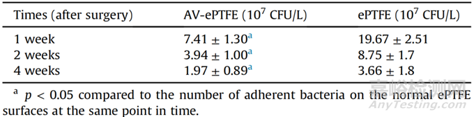 為了減少細(xì)菌粘附并促進(jìn) ePTFE 移植物的生物相容性,開發(fā)了一種稱為自體血管形成的方法。已經(jīng)指出,材料表面上的薄壁組織或血管網(wǎng)絡(luò)允許移植物存活。這種方法的想法是讓組織在 ePTFE 的孔隙中生長,從而避免細(xì)菌滲入,因為發(fā)現(xiàn)具有生物活性的內(nèi)皮細(xì)胞表面的細(xì)菌存活是有限的。研究已經(jīng)評估了其在動物模型植入部位對抗細(xì)菌存活和慢性炎癥的效率。在這里,我們提出了一項研究,首先將 ePTFE 材料植入 30 只大鼠的富含血液的皮下組織中,持續(xù) 4 周、8 周和 12 周。然后通過注射表皮葡萄球菌將生物復(fù)合材料植入目標(biāo)位置。對照組在沒有預(yù)先植入的情況下接受 ePTFE。細(xì)菌粘附表明,與未改性的 ePTFE 相比,使用 AV-ePTFE 后材料表面的細(xì)菌數(shù)量大約減少了兩倍(表 1)。它也會隨著時間的推移而減少。即使這項研究看起來有效,也可能會提出額外干預(yù)部位的手術(shù)并發(fā)癥的問題。