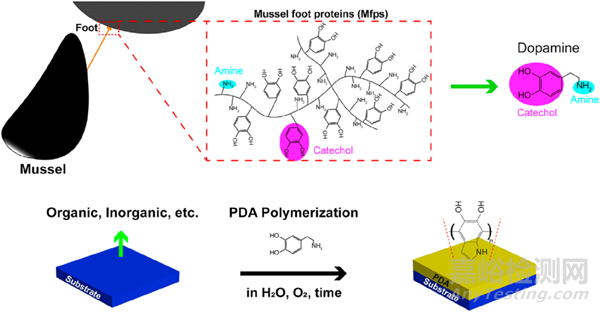 圖 1. 多巴胺受貽貝啟發(fā)的化學(xué)示意圖,用作合成和沉積保形聚多巴胺 (PDA) 薄膜的前體材料。
