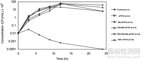 圖 3. 金黃色葡萄球菌的濃度作為實驗序列時間的函數(shù)繪制:對照、ePTFE、MA-ePTFE、PEG-MA-ePTFE、PEN-PEG-MA-ePTFE 和 PEN-ePTFE。
