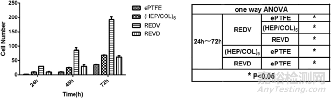圖 5. 未修飾的 ePTFE、(HEP/COL)5 修飾的 ePTFE、REDV-(HEP/COL)5 修飾的 ePTFE 和 REVD-(HEP/COL)5 修飾的 ePTFE 上附著的細(xì)胞數(shù)(24、48 和 72 小時,)* 表示在 p<0.05 水平上具有統(tǒng)計學(xué)顯著性差異)。