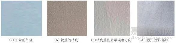 輥涂中常出現(xiàn)的涂膜缺陷有桔皮、縮孔、針孔等; 其中桔皮是最直觀的體現(xiàn),表現(xiàn)為桔皮花紋的立體感過強、顆粒粗大、甚至有露底的現(xiàn)象。影響輥涂外觀的因素也有很多,如施工黏度、溶劑的揮發(fā)梯度和溶解性能、涂料的表面張力、濕膜厚度、涂料的流變性和環(huán)境溫度等,其中涂料的流變性是重要的影響因素。
