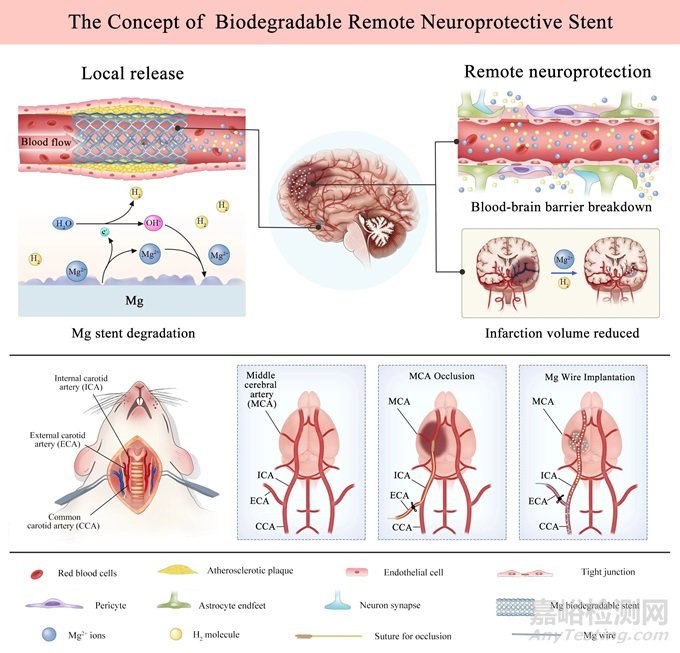 針對(duì)上述問(wèn)題,本研究利用可生物降解的金屬鎂能夠產(chǎn)生和釋放神經(jīng)保護(hù)物質(zhì)Mg2+/H2,創(chuàng)新性地將可降解鎂植入物用于急性梗死性卒中治療,以評(píng)估“可生物降解神經(jīng)保護(hù)支架”的可行性(圖1)。