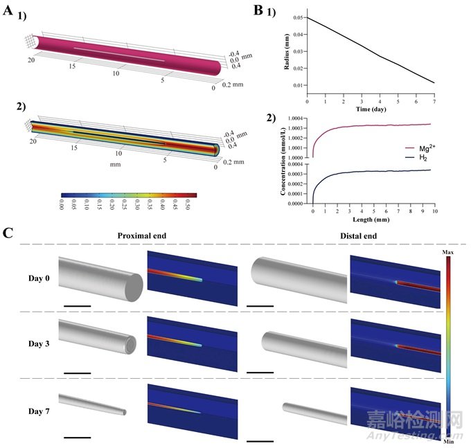 在實(shí)驗(yàn)之前,使用計(jì)算模型模擬和分析了植入頸總動(dòng)脈(CCA)的鎂金屬中Mg2+/H2的釋放模式,并證實(shí)了Mg2+/H2的快速初始釋放(圖2)。