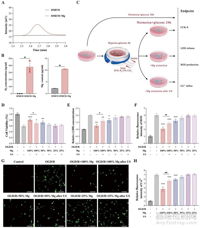 將鎂金屬浸入培養(yǎng)基中后,證實(shí)了Mg2+/H2的存在,并利用浸提培養(yǎng)基培養(yǎng)氧葡萄糖剝奪/復(fù)氧(OGD/R)損傷的神經(jīng)元細(xì)胞,觀察到鎂金屬降解的神經(jīng)保護(hù)潛力。其神經(jīng)保護(hù)作用源于Mg2+和H2對(duì)ROS產(chǎn)生和Ca2+超載的協(xié)同抑制作用(圖3)。