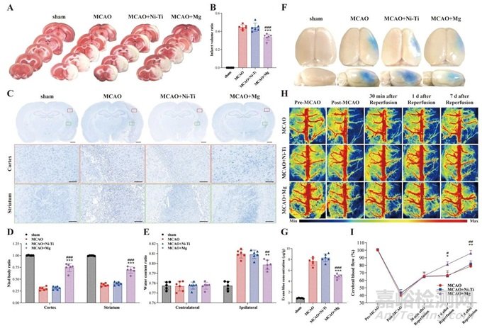 鑒于鎂降解產(chǎn)物的體外神經(jīng)保護(hù)作用,在缺血后和再灌注開(kāi)始時(shí)將鎂絲植入大鼠頸總動(dòng)脈,以評(píng)估其對(duì)體內(nèi)再灌注損傷的保護(hù)作用。行為測(cè)試結(jié)果表明,鎂絲植入可以保護(hù)受損的神經(jīng)功能(圖4)。組織學(xué)測(cè)試結(jié)果表明,鎂絲植入可以保護(hù)神經(jīng)細(xì)胞,減少血腦屏障破壞,促進(jìn)腦血流恢復(fù)(圖5)。
