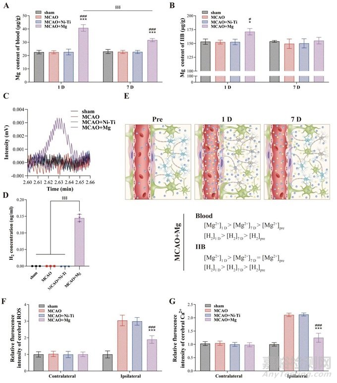 對(duì)血液和腦中Mg2+和H2濃度的提升進(jìn)行了測(cè)定和推斷,還對(duì)腦中的ROS和Ca2+濃度進(jìn)行的測(cè)定,這進(jìn)一步證實(shí)了Mg2+/H2具有體內(nèi)神經(jīng)保護(hù)作用,其保護(hù)作用是通過(guò)降低腦中ROS的產(chǎn)生和Ca2+超載實(shí)現(xiàn)的(圖7)。