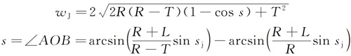 如圖4所示,隨著射線束與水平面之間角度的增加,透照厚度增加。從圖中的三角形關(guān)系可知AB=CD,其透照總厚度為AB+CD,在ΔOAB中,徑向透照厚度wJ 滿足關(guān)系式(3):