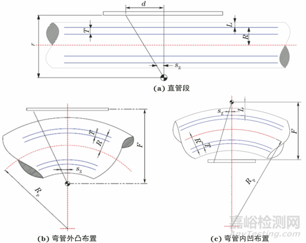 在軸向,隨著射線束偏離中心,透照厚度也增加,然而與徑向變化不同的是,透照厚度的軸向變化需要考慮直管段和彎管。如圖5所示,不同情況下射線束的透照厚度計算方式有所不同。