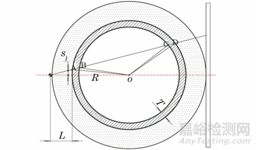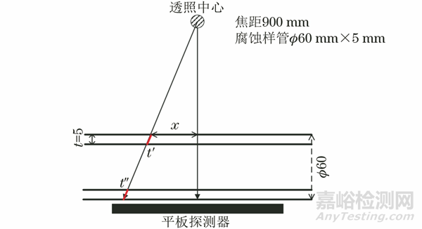 當(dāng)采用切向法對管道腐蝕進行檢測時,被檢區(qū)域外壁透照厚度為0,內(nèi)壁透照厚度(圖1中AB)最大。