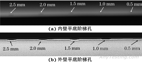 試驗設(shè)計模擬試樣,規(guī)格為?60 mm×5 mm,并在內(nèi)壁/外壁刻一排?5 mm階梯孔,孔深分別為0.5,1.0,1.5,2.0,2.5 mm。采用X射線數(shù)字成像系統(tǒng)對模擬試樣進行檢測,采用直徑為10 mm的小球作為標定器,試驗工藝參數(shù)如表1所示。檢測圖像見圖7,采用小球試塊對尺寸標定后,用交互式方法測量管壁厚度和所有平底孔的深度,表2為測量結(jié)果及誤差。