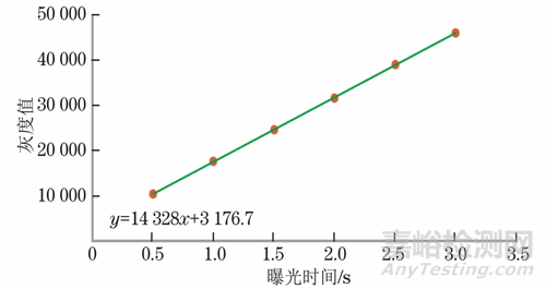 為驗證試驗用數(shù)字射線成像系統(tǒng)接收射線強度與底片灰度間具有良好的線性,采用階梯試塊,固定電壓、電流分別為120 kV和1.5 mA,選用不同的曝光時間進行垂直透照試驗,選取圖像中階梯試塊上3個固定位置的灰度取平均值。根據(jù)數(shù)據(jù)繪制灰度值與曝光時間的曲線,如圖8所示,數(shù)字射線成像系統(tǒng)測得的灰度值與曝光時間呈良好的線性關(guān)系。