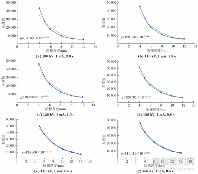 根據(jù)公式(4),射線強度(灰度值)與透照厚度呈指數(shù)關(guān)系,對數(shù)據(jù)進行擬合,得到不同透照參數(shù)下灰度值與階梯試塊厚度的對應(yīng)關(guān)系見圖9,其中虛線為擬合后的指數(shù)關(guān)系,可見圖像灰度值與階梯試塊厚度呈類似指數(shù)關(guān)系,衰減系數(shù)隨著透照電壓的增加而減小。