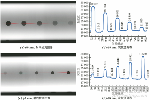 圖11 ?5 mm和?8 mm平底孔的射線檢測圖像及孔中心的灰度值分布
