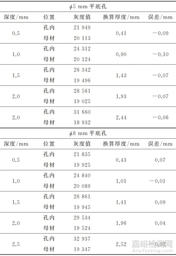 圖11為?5 mm平底孔和?8 mm平底孔的射線檢測圖像及孔中心的灰度值分布,分別測量平底孔中心和孔外母材均勻部分的灰度值(測量點數(shù)量不少于3個),取其平均值,根據(jù)公式(7)將灰度值換算成厚度,數(shù)據(jù)記錄如表3所示。