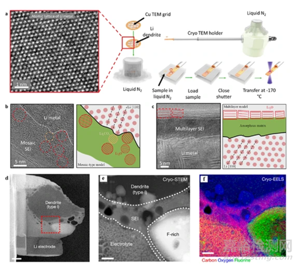 圖. 冷凍電鏡在電池材料中的應(yīng)用。(a)鋰金屬原子分辨率冷凍電鏡圖像和低溫傳輸過(guò)程示意圖;在不同電解質(zhì)中觀察到的(b)固態(tài)電解質(zhì)膜(SEI)和(c)多層SEI的冷凍電鏡圖像;(d)電子透明的低溫聚焦離子束抬升;(e)電池內(nèi)部固液界面處的冷凍電鏡圖像;(f)電子能量損失譜(EELS)顯示出界面處碳、氧和氟元素分布15