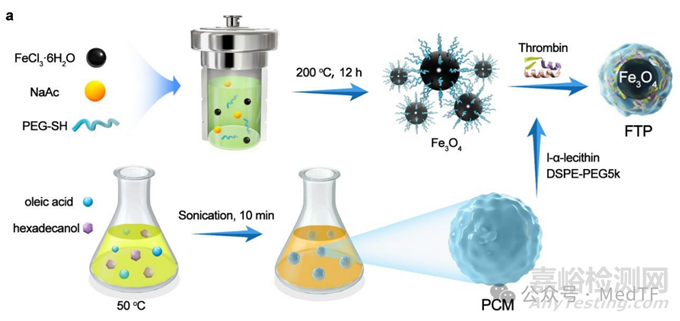FTP nanorobot是一款可以通過體外磁場(chǎng)控制的磁性納米機(jī)器人。FTP nanorobot由四氧化三鐵納米顆粒、天然的凝血蛋白Th和PCM(phase-change material)涂層組成。PCM涂層將四氧化三鐵納米顆粒包裹在里面。