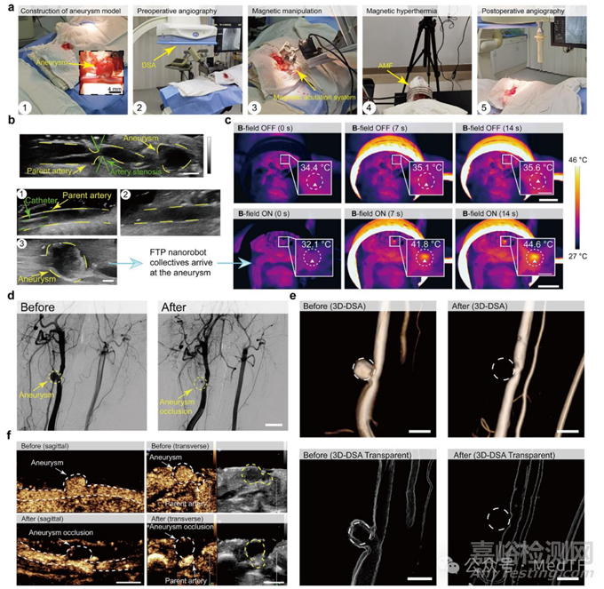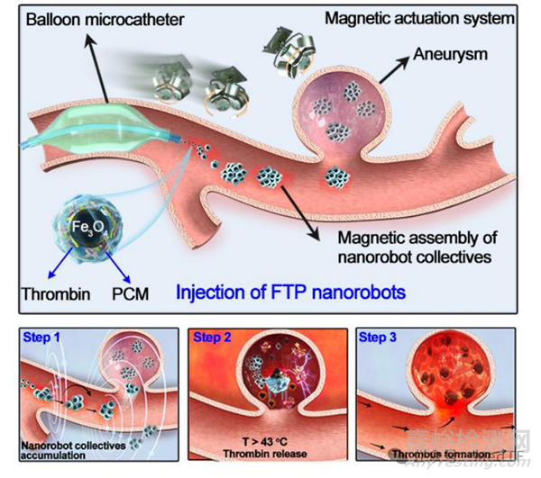 FTP nanorobot在DSA下,通過球囊微導(dǎo)管將納米機(jī)器人輸送到預(yù)定位置,然后通過體外可控磁場(chǎng)。將納米機(jī)器人引導(dǎo)至動(dòng)脈瘤內(nèi),當(dāng)納米機(jī)器人不斷聚集時(shí)外部磁場(chǎng)使納米機(jī)器人溫度不斷升高,直到溫度超過PCM相轉(zhuǎn)變溫度(43℃)。納米機(jī)器人涂層PCM融化,釋放天然的凝血蛋白Th,使動(dòng)脈瘤內(nèi)的血液快速凝固,實(shí)現(xiàn)對(duì)動(dòng)脈瘤栓塞。